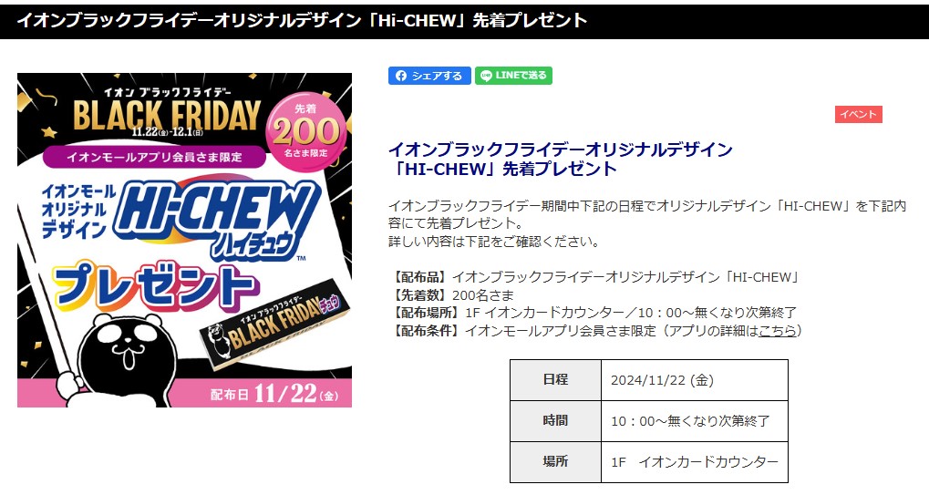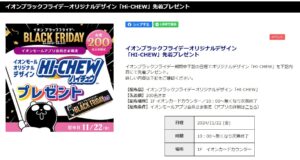 イオンモール_水戸内原 イオンブラックフライデーオリジナルデザイン「HI-CHEW」先着プレゼント その他のブログ Others TOP > Blog > イオンモール_水戸内原 イオンブラックフライデーオリジナルデザイン「HI-CHEW」先着プレゼント | キャンペーン事務局代行‐実績1万件以上のパルディアにお任せ