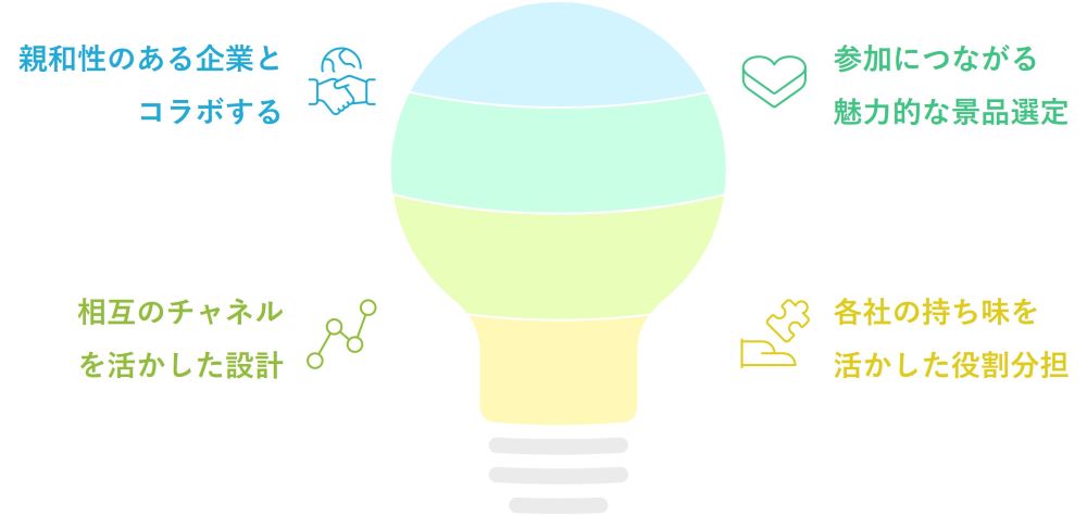 各企業の強みを活かして役割を分担することで、キャンペーンの効率的な運営が可能になります。例えば、キャンペーン企画やクリエイティブ制作に強みを持つ企業、集客のためのデジタルチャネルやSNS運営を得意とする企業、独自の商品や賞品の提供が得意な企業など、それぞれが自社の専門分野を担当することで、全体の成果を最大化できます。