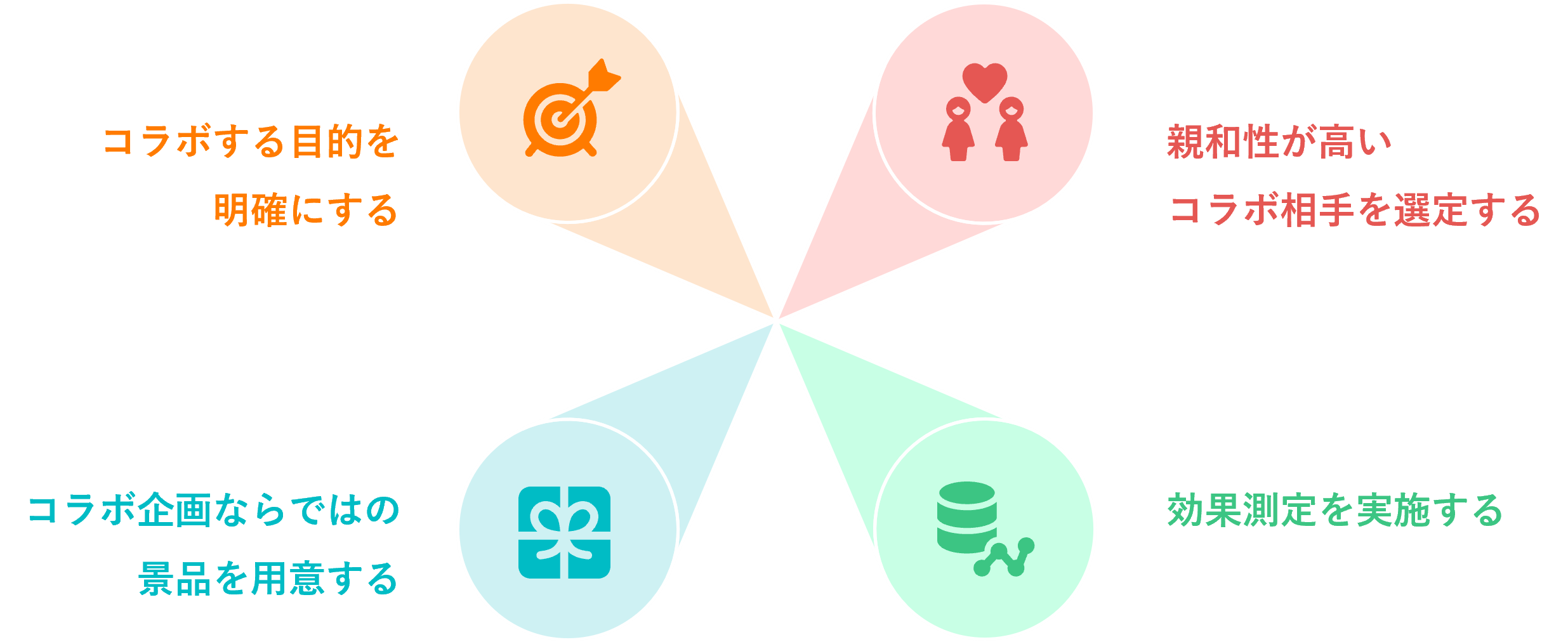 コラボするIPと自社商品やブランドのイメージが合致しているか確認しましょう。共通のテーマやターゲットが存在すれば、相乗効果が期待できキャンペーンのメッセージもより深く消費者へ届けることができ応募につながります。