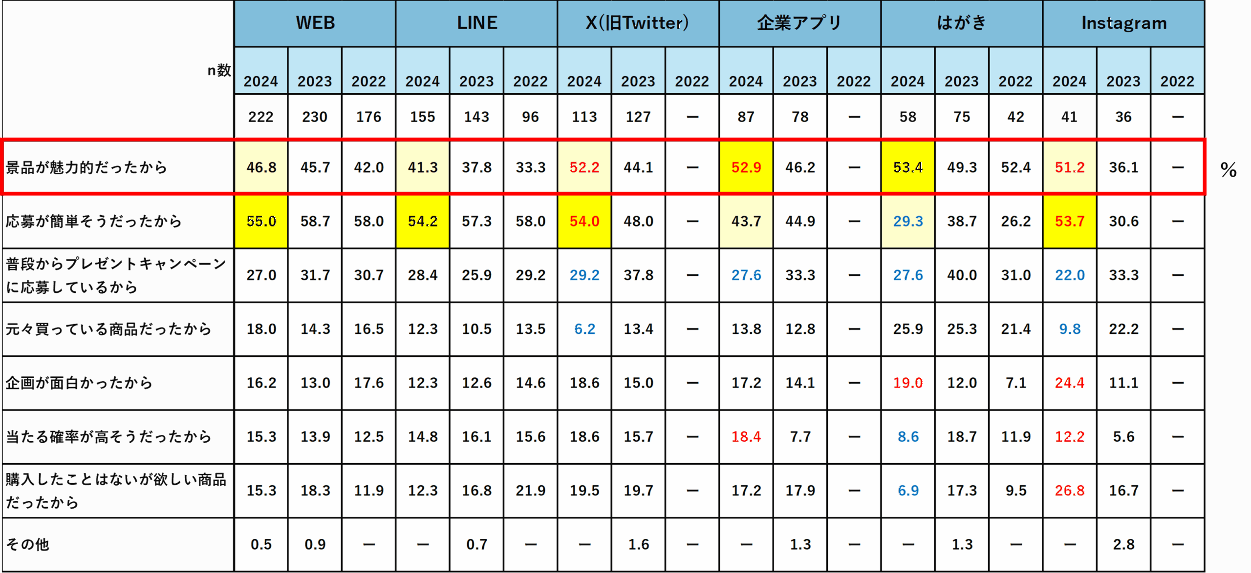 実際に弊社が実施した調査でも消費者に応募のきっかけを聞いたところ、「景品の魅力度」がオープンキャンペーン、クローズドキャンペーンともに1位となっております。