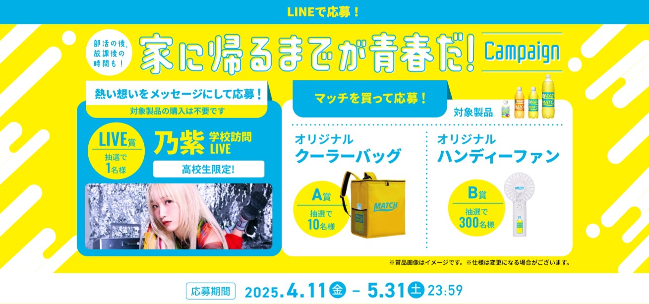 一方、クローズドキャンペーンでは対象製品「MATCH」の購入者を対象に、オリジナルのクーラーバッグまたはオリジナルのハンディーファンが当たるプレゼント企画が実施されました。クーラーバッグは対象製品を5本購入したレシートで応募可能、ハンディーファンは対象製品を2本購入することで応募が可能となっております。