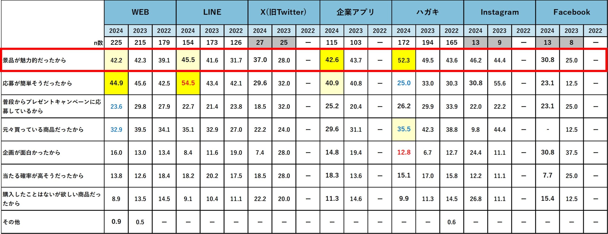 弊社が実施した「キャンペーンに関する消費者意識と実態調査レポート」よりキャンペーン応募の動機として「景品の魅力」は常に上位に挙げられています。前述したようにデジタルインセンティブは景品として消費者からの人気が高く魅力的に映りやすいため、応募数アップにも有効だと考えられます。