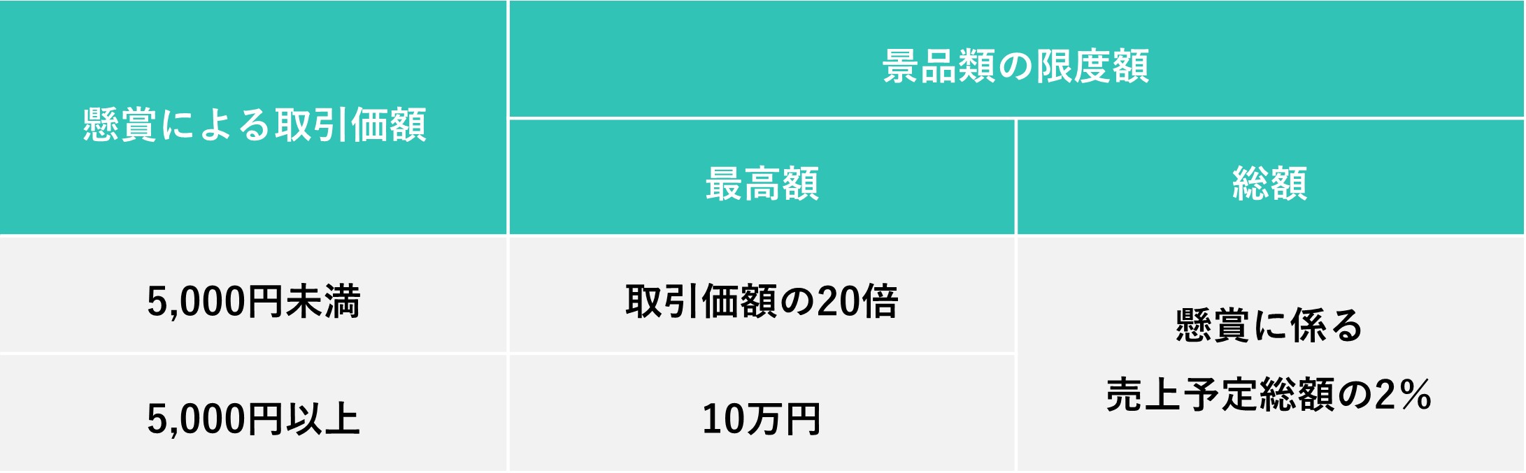 キャンペーンにおける景品の金額や提供条件には、景品表示法の制限があります。たとえば「購入者の中から、抽選で100名様にデジタルインセンティブをプレゼント」のような「一般懸賞」に分類される場合は、下記のようなルールがあるため、あらかじめ法的なチェックを行いましょう。