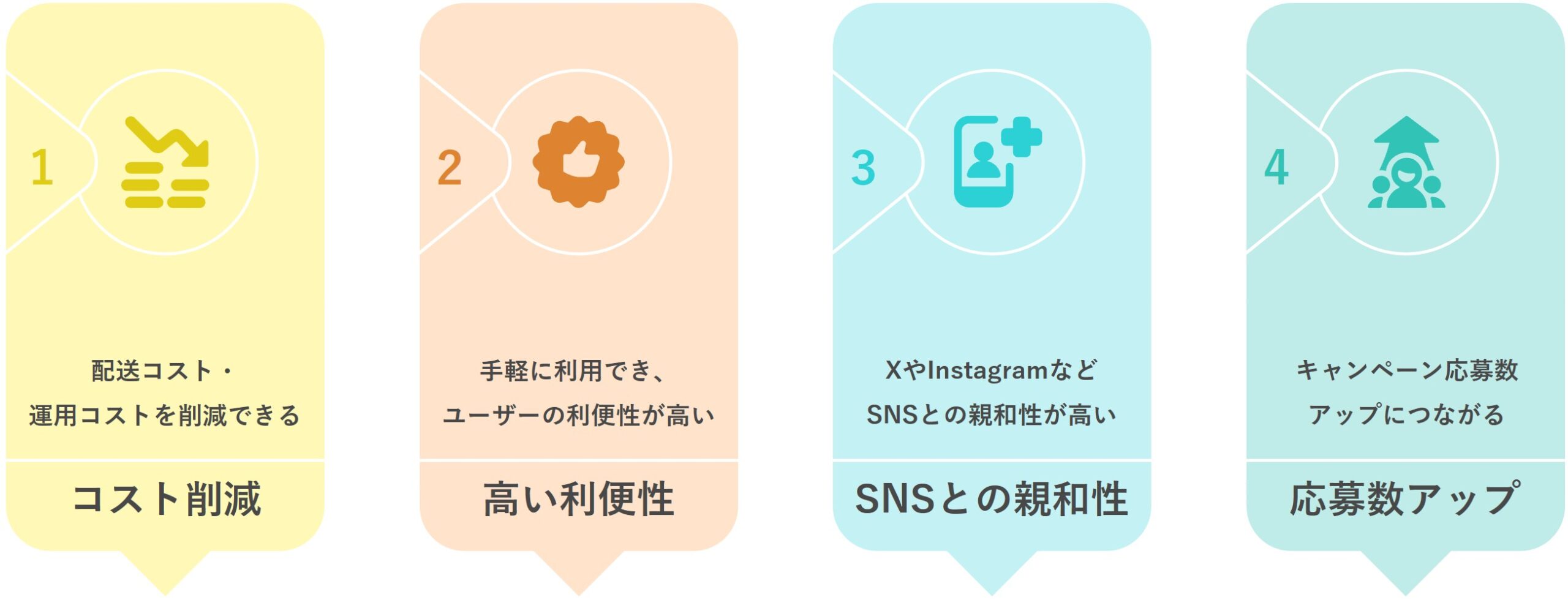 デジタルで景品を送付できるため、配送費用や応募ハガキの管理、情報処理などキャンペーン運用にかかるコストを大きく抑えることが出来ます。在庫管理の必要もなく、Wチャンス賞としても導入しやすいのが特長です。