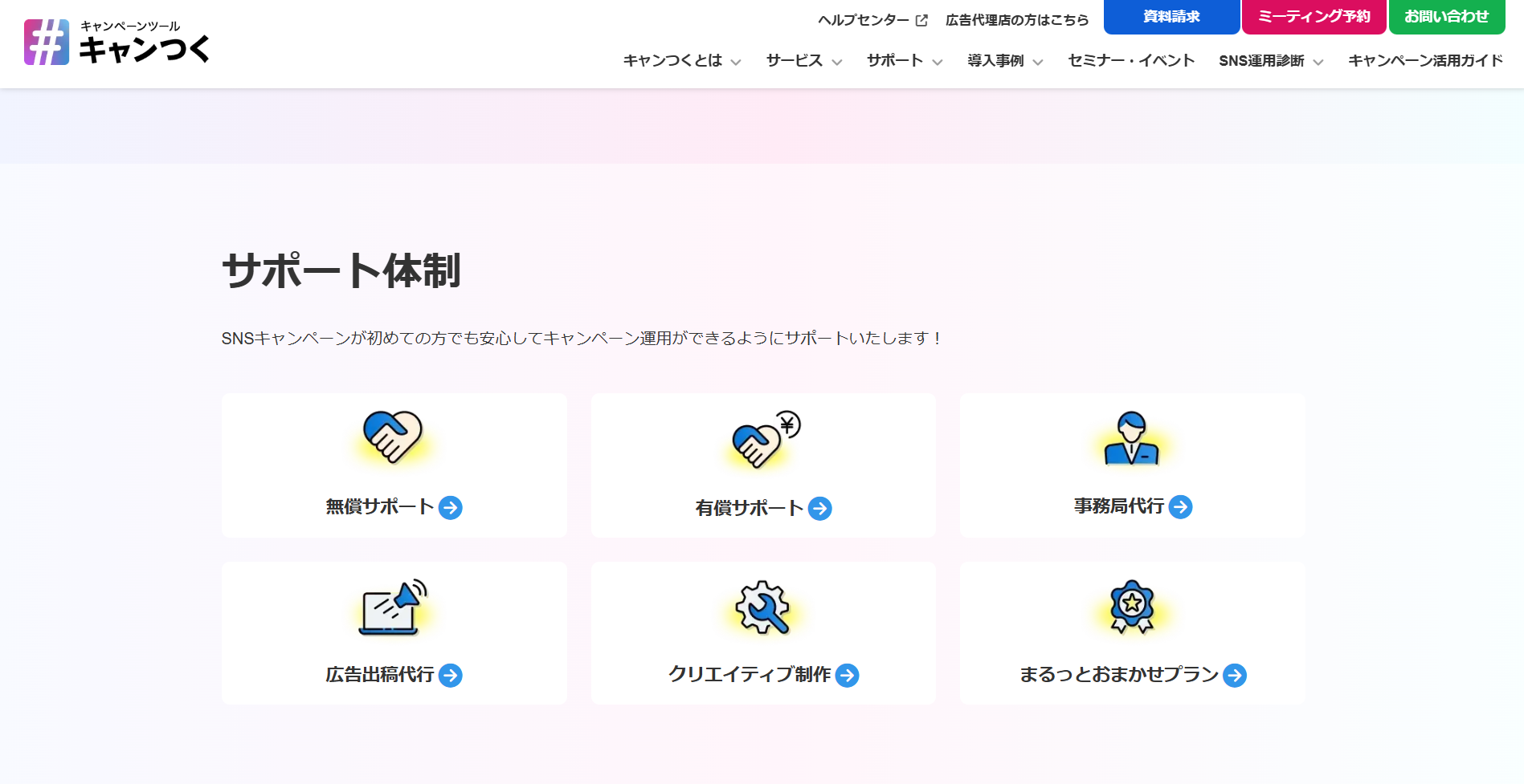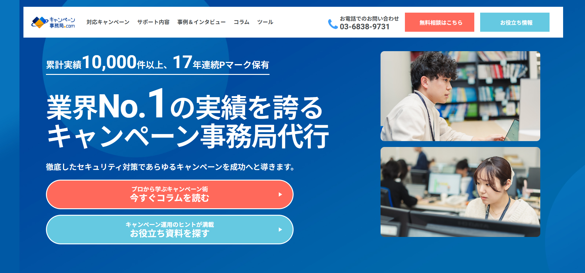 応募受付から問い合わせ対応、景品発送、レポート作成まで、キャンペーン事務局業務をワンストップで提供するキャンペーンの専門会社です。年間約1,000件・累計10,000件以上の事務局運営実績に加え、自社のキャンペーンデータベース「CAM-SAKU」や、過去の実施結果を体系化した「キャンペーンランキング」など、業界最大級のデータ資産を保有しています。これらのデータに基づく分析・改善提案を組み合わせ、単なるキャンペーン支援だけではなく、成果向上にコミットする“伴走型のコンサルティング”を提供できる点が最大の特徴です。
