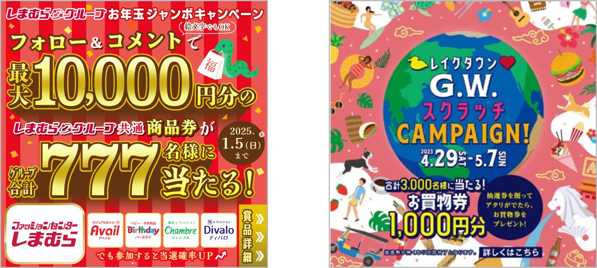 当落がその場で分かりすぐに景品を受け取れる「インスタントウィン」など、ユーザーの参加率や拡散性の高いSNS でのキャンペーンと組み合わせやすいです。