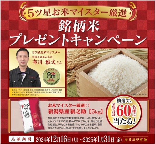 また、こちらは米菓メーカーである亀田製菓のキャンペーンでお米を景品としています。「亀田製菓→おせんべい→お米」と連想しやすく、お米マイスターが厳選した銘柄米が当たるという消費者からの注目を集めやすい景品選定となっております。お米は家庭での消費量が多く、生活必需品といえるため、物価高の影響もあり景品としても人気が高い食品の一つです。お米の美味しさについてアピールするためにも、有名ブランド米を採用するのがおすすめです。