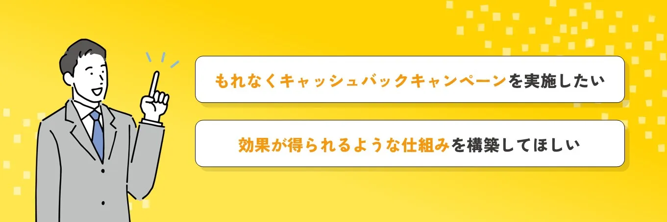 もれなくキャッシュバックキャンペーンは記載の通り、工数が大きいキャンペーンです。しかしながら、効果としても大きく、しっかり目的とターゲットを設定して実施することで、その期間中の売り上げを大きく後押しできる施策でもあります。そのため、こういった複雑な案件も是非ご相談いただければより安定したサポートができると存じます。