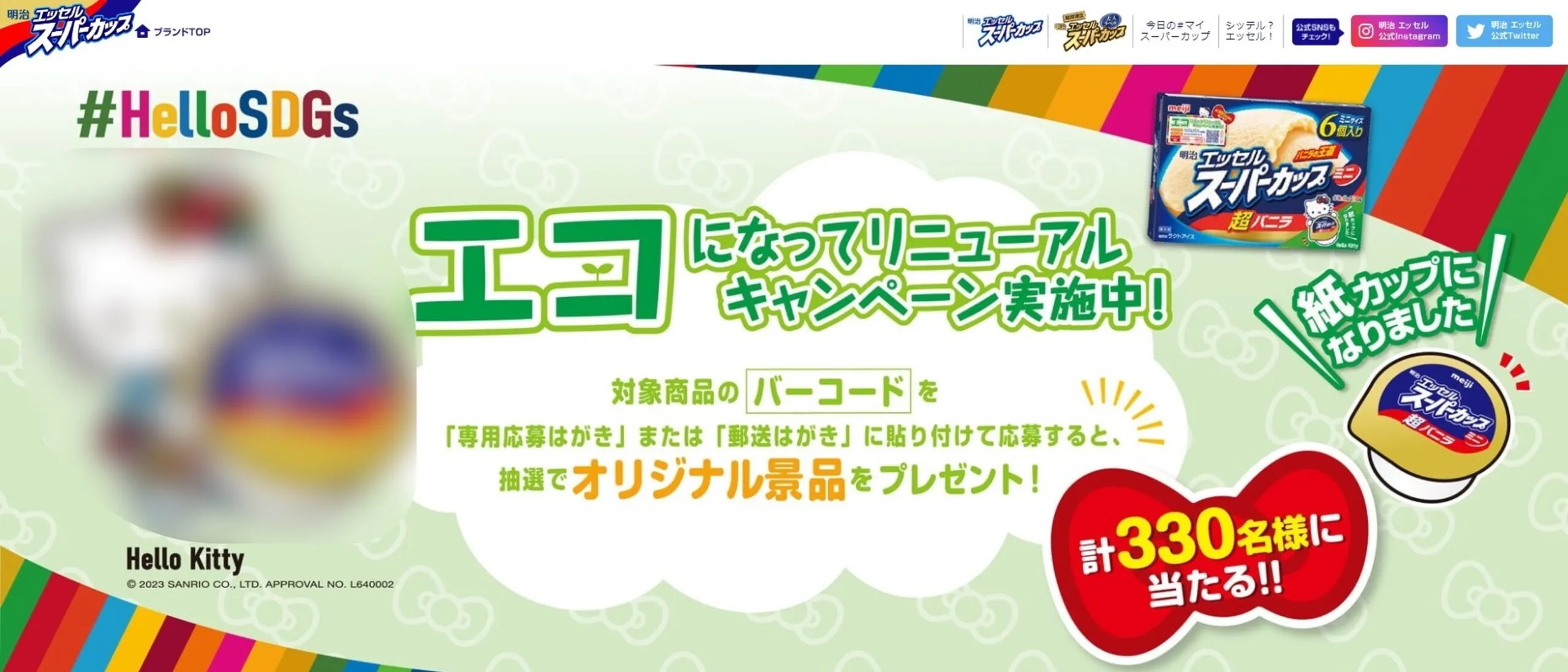 SDGsに配慮したパッケージのリニューアルに伴い、サンリオがSDGsを推進する「HelloSDGs」プロジェクトとのタイアップキャンペーンです。対象商品のバーコード2点をハガキに貼付して応募ができます。コース名はコラボ相手にちなんだ「ハローキティ賞」と銘打っており、思わず応募したくなる工夫がされております。